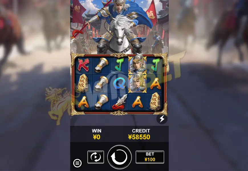 這是一款以三國時代為背景的線上老虎機遊戲,畫面風格充滿中國古代戰爭元素,主題角色三國名將以趙雲為主。