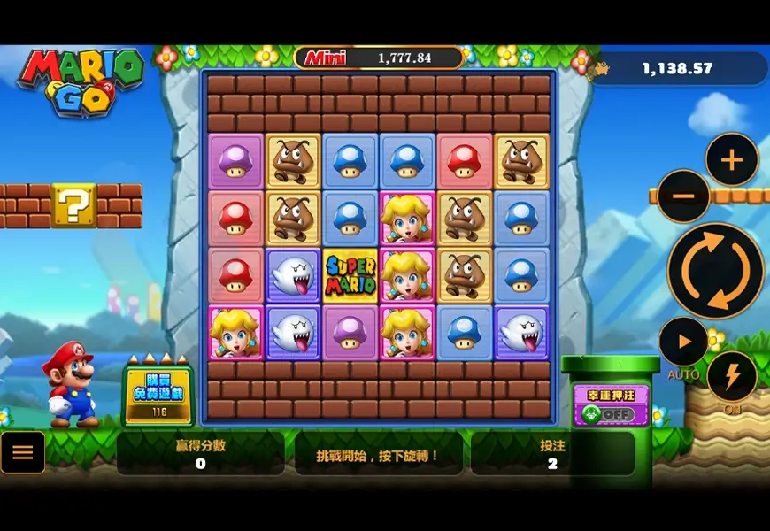 歡迎來到Mario Go的奇幻世界,和勇敢的瑪利歐一起開啟無盡的冒險旅程!在這片魔法般的領域,每一次旋轉都充滿驚喜和巨額的獎勳。在幸運押注功能啟動後,遊戲畫面將從4×6擴展到6×6,為您帶來前所未有的贏取機會。