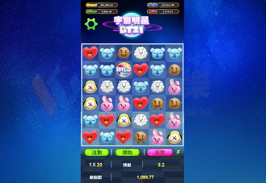 宇宙明星 BT21特別的是累積消除型的老虎機,它同樣也有免費遊戲,但無法另外購買。宇宙明星 BT21是一款需要等待吐分期的老虎機,玩家可以在累積消除達三次以上之後,試著提高注金,通常這時候比較容易爆分。