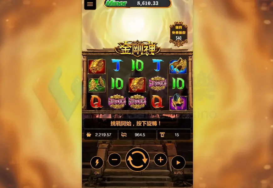 在免費遊戲模式中,每次旋轉都有機會隨機擴展盤面至4×5或5×5,帶來意想不到的驚喜!此外,每當金剛神現身,都可能觸發百搭符號,進一步提升您的獲獎機率!現在就勇敢迎戰,與金剛神並肩作戰,征服戰場,贏取豐厚獎勵!