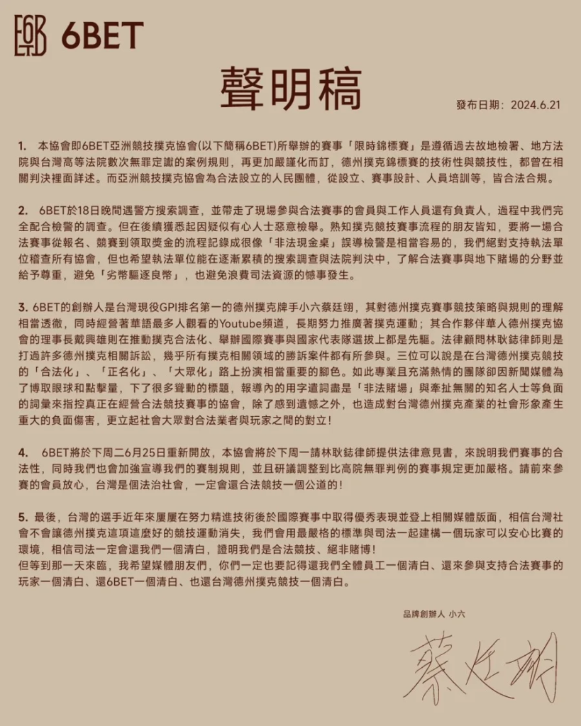 在6/21,6BET撲克協會也針對這次事件發出5點聲明強調,當警方對協會進行搜查時,看來是有人惡意檢舉。據知情人士透露,在警方行動前幾天就已經有傳聞說警察會來逮捕人。更離譜的是,警方行動后的隔天,就有中間人暗示,只要支付公關費,就能避免再遭麻煩。